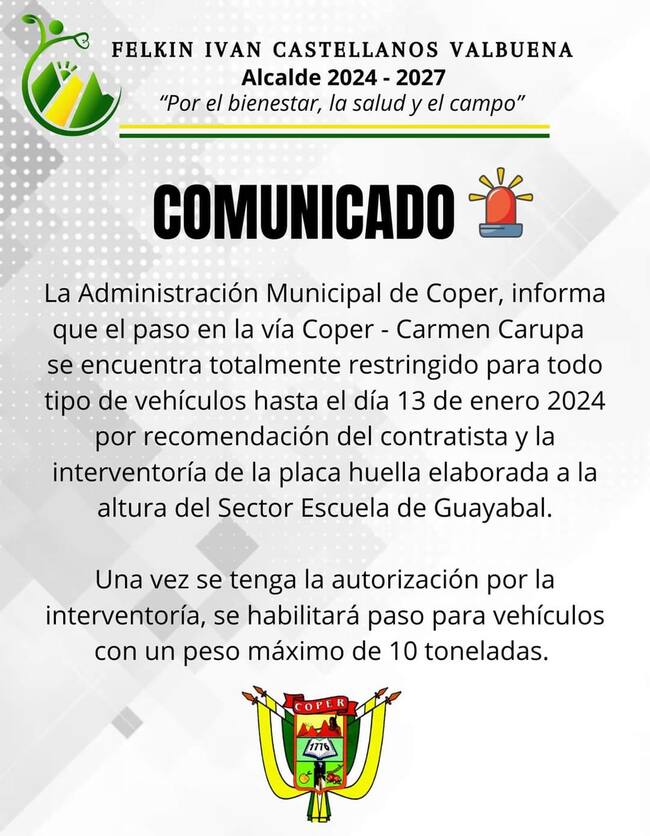 “El paso por este sector se encuentra cerrado por cuenta de la elaboración de una placa huella de aproximadamente 200 metros. Nosotros nos hemos comunicado con los contratistas y el contratista con la interventoría para que nos emitieran un concepto técnico para poder dar paso, precisamente para las fiestas de fin de año, ellos nos dijeron que no podían emitir un concepto técnico porque el tiempo de la placa iba hasta el 13 de enero y seguramente, posterior a esa fecha, nos iban a dar el concepto pero únicamente para que pudieran pasar vehículos de hasta 10 toneladas de peso y luego emitirían un concepto seguramente después del 3 de febrero para que ya pudiera pasar los carros de más de 10 toneladas de peso”, señaló Felkin Castellanos, alcalde de Coper.