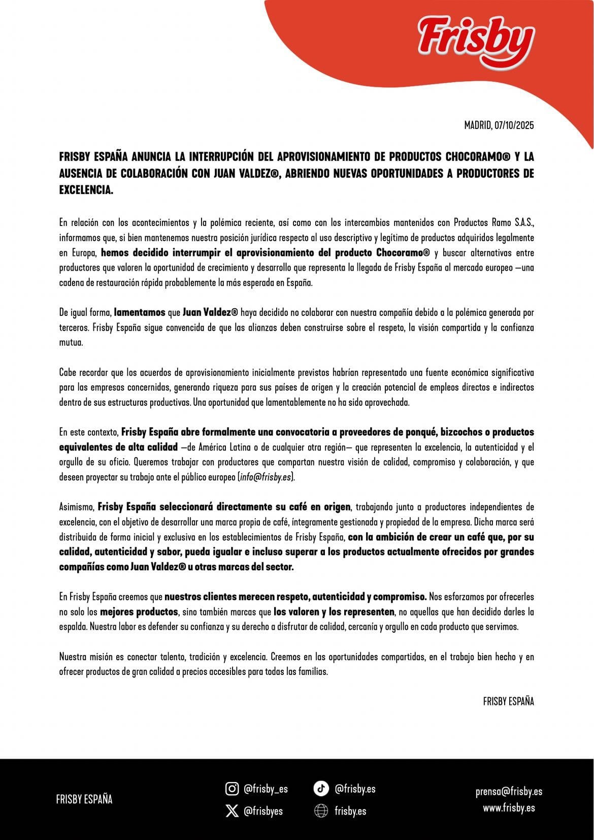 La noticia sobre la salida de la malteada Chocoramo del menú se dio a conocer a través de un comunicado publicado por Frisby España donde de forma textual la marca "anuncia la interrupción del aprovisionamiento de productos Chocoramo y la ausencia de colaboración con Juan Valdez, abriendo oportunidades a productores de excelencia".